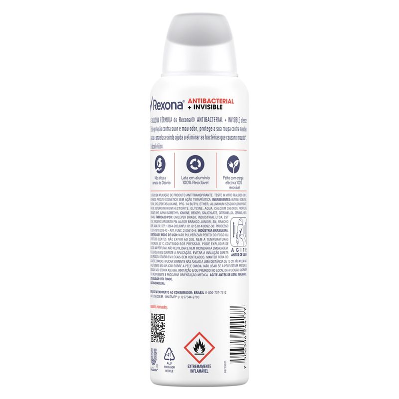Desodorante Antitraspirante Aerosol Rexona Feminino Antibacterial + Invisible 150ml