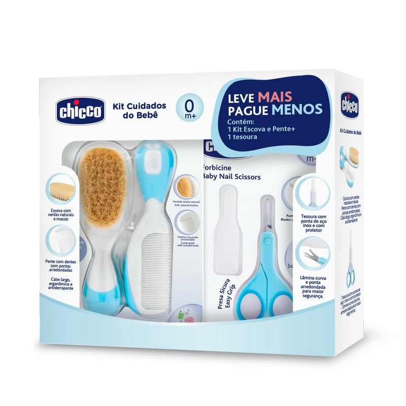 Kit Chicco Cuidados do Bebê Azul Escova 1 Unidade + Pente 1 Unidade + Tesoura 1 Unidade